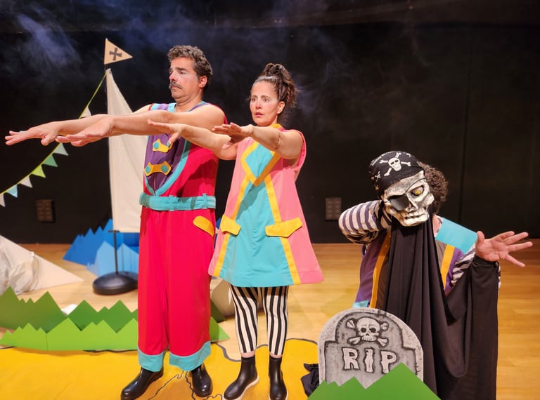 Mapa do Tesouro é uma peça teatral interativa que transforma o espaço cênico em um grande jogo compartilhado com o público. Ao longo do espetáculo, diferentes brincadeiras surgem como parte da ação, convidando crianças e adultos a participar ativamente, brincar junto e colaborar para que a cena avance. O teatro se constrói como um território lúdico, onde o movimento, a imaginação e a participação do público são essenciais para a experiência.